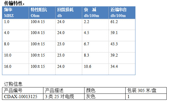 三类大对数电缆主要设计用于语音或数据主干等低速通讯网络应用,任何挑出4对芯线可支持10兆以太网(IEEE802.3)应用,所有传输性能指标超过国际标准ISO/IEC 11801和TIA/EIA 568中相应级别的要求。
