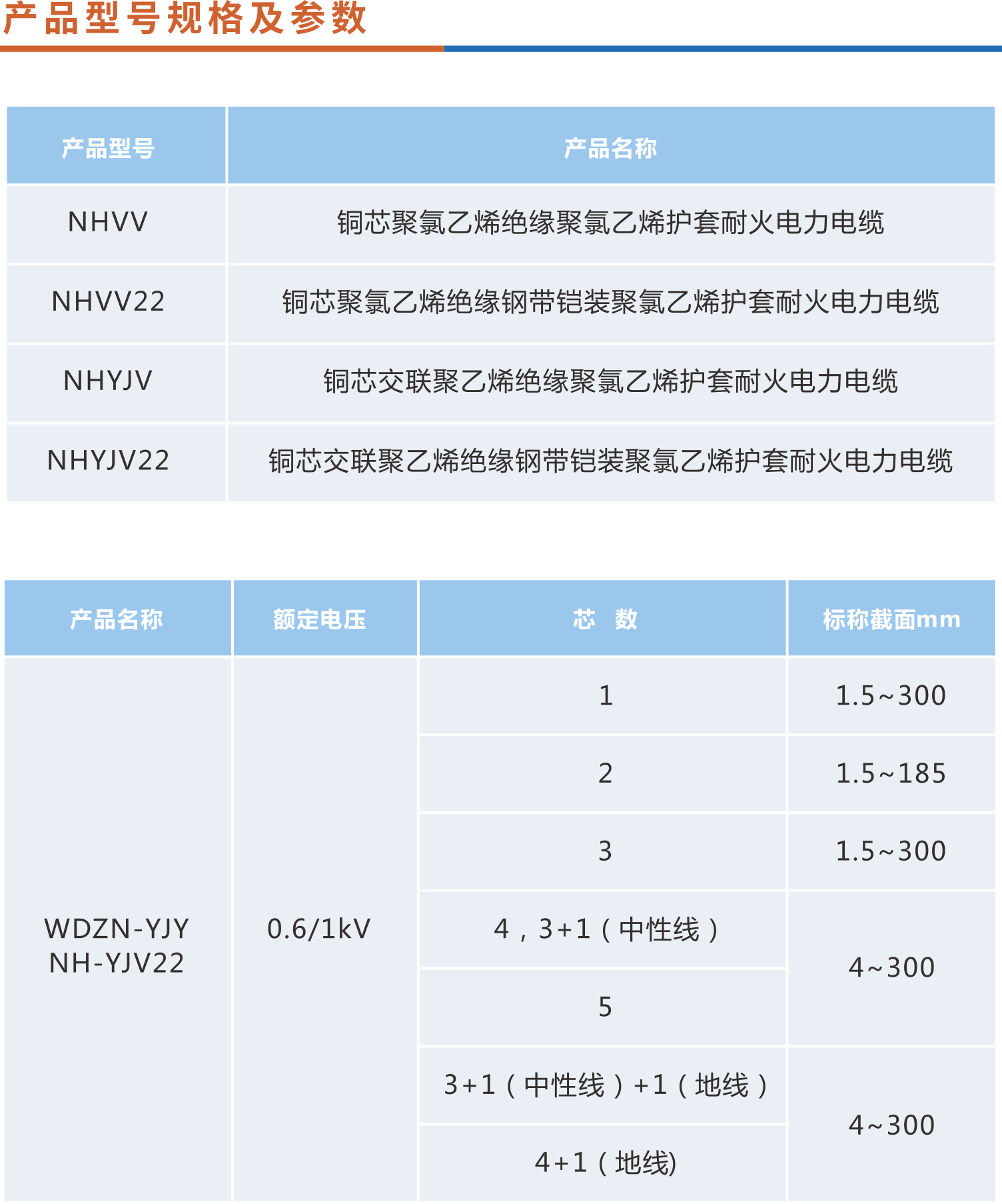 前加上字母‘NH’组成,如NHVV,NHVV22,NHYJV,NHYJV22具体型号名称见表